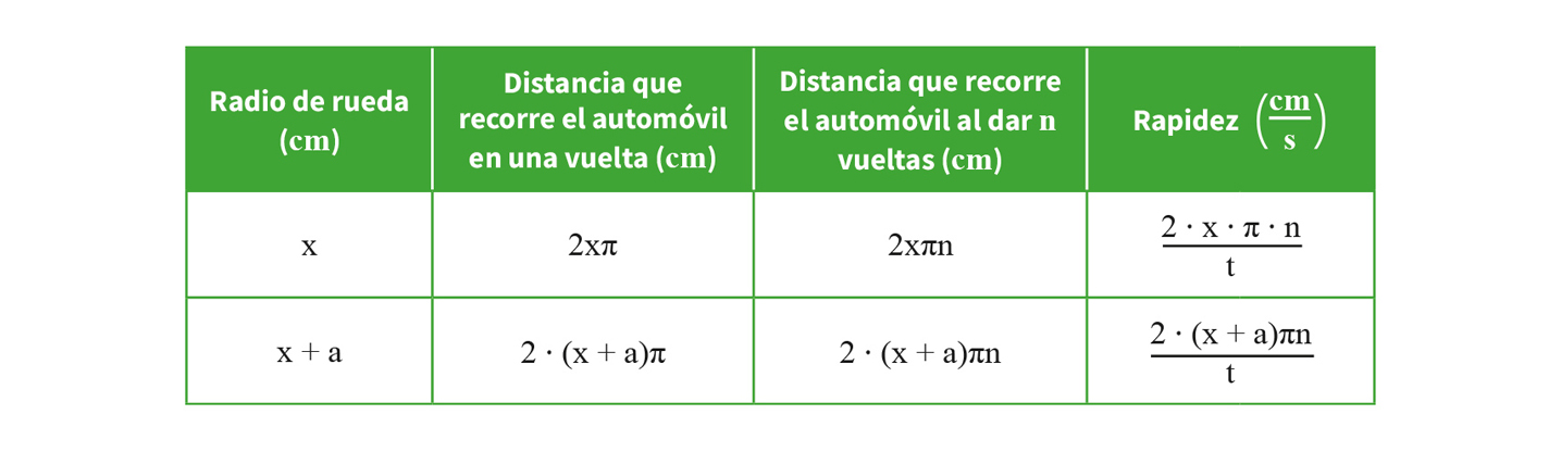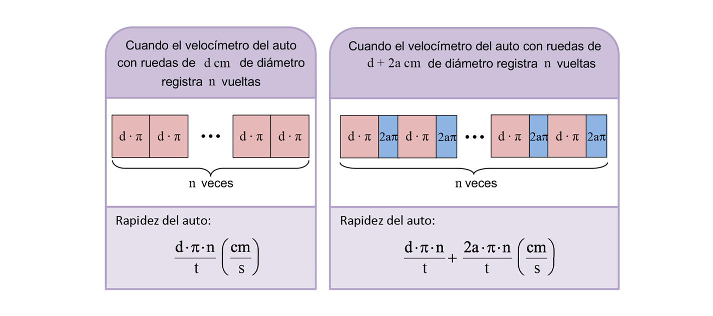 La habilidad de relacionar variables, en este caso la rapidez de un automóvil con el perímetro del círculo que corresponde a cada una de sus ruedas y de analizar el efecto que produce el cambio de un parámetro (diámetro de las ruedas) en el modelo de la rapidez que representa el velocímetro. Esto, para realizar el ajuste al modelo según las condiciones del contexto que se expresan en un lenguaje algebraico y formal.