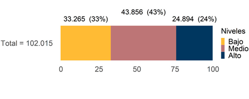 En los resultados del gráfico 3, se observa que, si bien gran parte de la población se ubicaría en un nivel medio, con un 43%, el resto se distribuiría entre quienes estarían en un nivel bajo de Autoeficacia académica con un 33% y un nivel alto con un 24%. En particular, se ha evidenciado que tener una Autoeficacia académica relativamente alta resulta beneficioso para la consecución de las metas personales, por lo que se trata de información potencialmente útil para pensar estrategias de transición a la educación superior, por ejemplo, respecto al involucramiento de los y las estudiantes con sus tareas académicas.