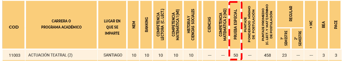 A continuación, puedes ver un ejemplo del requisito de prueba especial con ponderación en la carrera de Actuación Teatral de la Universidad de Chile (de acuerdo a las ponderaciones del Proceso de Admisión 2026):